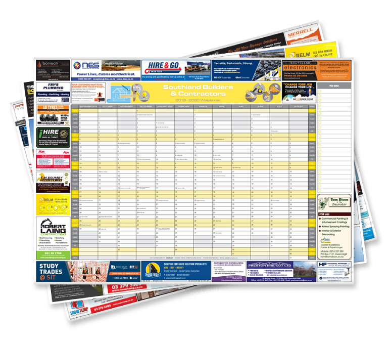 We also print and deliver desk pads and wall planners that are intended for particular professions, including accountants, architects, barristers & solicitors, builders, contractors and school principals. As well as a variety of industries such as motels, hotels & restaurants, transport, and the motor vehicle trade. Distribution is both nationwide and location-specific, depending on the type of publication. All pre-press work is done onsite at our head office location in Christchurch.